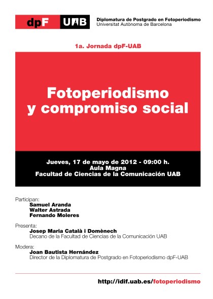 El próximo jueves 17 de mayo, de 16 a 21h, tendrá lugar en el Aula Magna de la Facultad de Ciencias de la Comunicación de la Universidad Autónoma de Barcelona el encuentro titulado «Fotoperiodismo y compromiso social» organizado por la Diplomatura de Postgrado en Fotoperiodismo UAB (dpF-UAB).