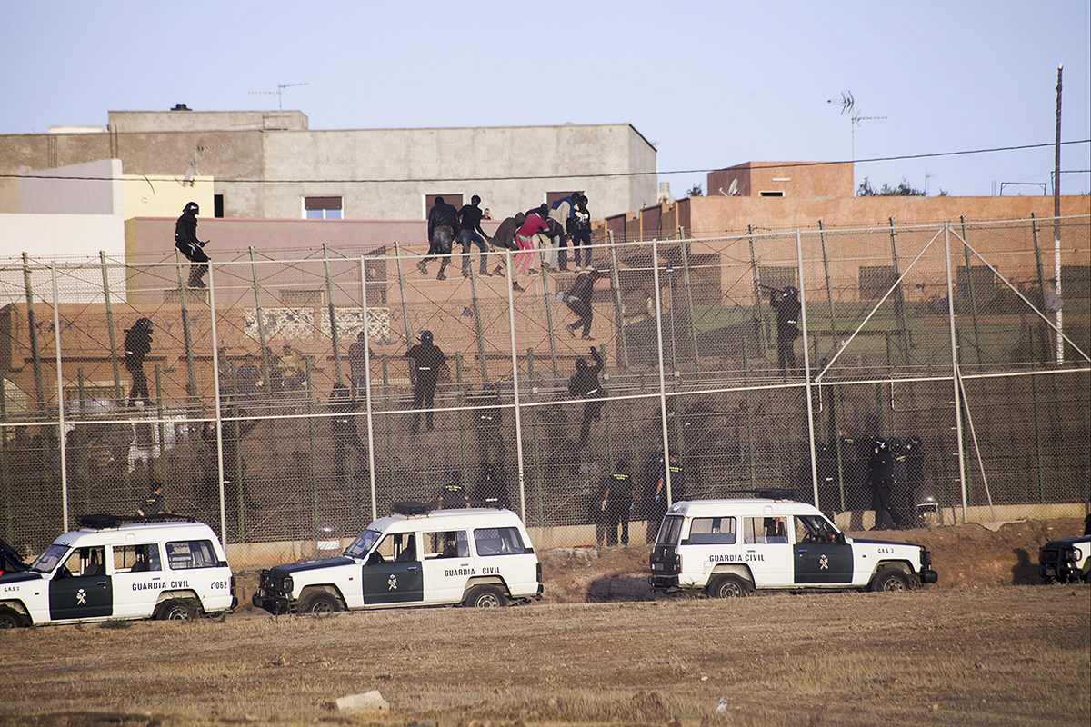La Guardia Civil española sube por la valla para obligar a los migrantes subsaharianos a bajar y devolverlos a Marruecos posteriormente.